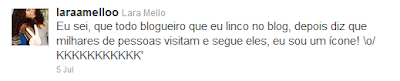 Lara, concordo com vc! Tem gente que não some mas faz três postagens por dia e não visita nem comenta em nenhum blog achando que tá com tudo, já exclui varios desses. Povo sem noção! bjuu